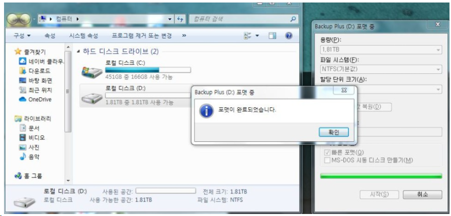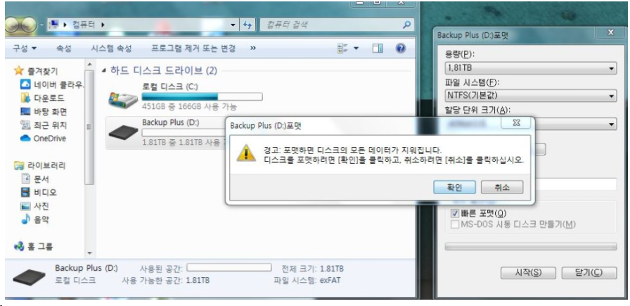 그럼 " 경고 : 포맷하면 디스크의 모든 데이터가 지워집니다. 디스크를 포맷하려면 [확인]을 클릭 취소하려면 [취소] 클릭" 창이 나옵니다.