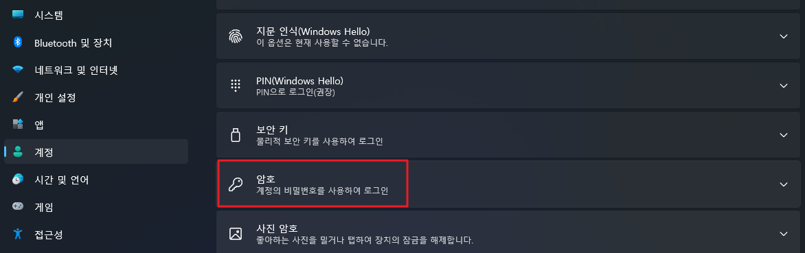 3. 로그인 옵션에 들어가면 다양한 암호 옵션들이 있습니다.