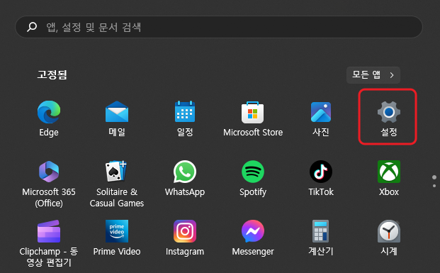 1. 윈도우 키 > 시작 > 설정 앱을 선택