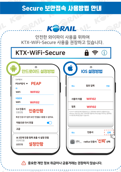 KTX에서는 기본적인 무료 Wi-Fi 서비스와 보안이 강화된 Secure Wi-Fi(유료 또는 통신사 제공)를 제공하는데 연결방법은 아래와 같습니다.